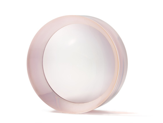 Fred Eversley is a member of the first generation of California Light and Space artists; his training and early employment as an aerospace engineer distinguish him from his peers. After he decided in 1967 to focus on making art, he brought this personal history to bear on his art practice. Rather than molding industrial resins and plastics to make his sculptures (as did many other Light and Space artists), Eversley used turntables—salvaged and retrofitted by the artist from originals designed to produce casings for the first atomic bombs—harnessing the centrifugal force they generated when revolving at high speeds to create thick concave disks out of liquid polyester resin. Eversley mathematically calculated the forms that resulted from this spinning process. He would then obsessively grind and polish the resulting forms by hand to complete his smooth and elegant “lenses,” as he calls them. He made lenses, beginning in 1969, in a variety of colors, at times even combining multiple colors in one sculpture; he continues to make similar forms (among others) today. Eversley wants his lenses to function in relation to changing environmental (especially lighting) conditions and the viewer’s own movement; as he has explained, “The pieces should be picked up, moved around, viewed under all kinds of light and from every possible perspective angle.” In this sense the lenses can be considered kinetic sculptures, though without having actual moving parts. The pared-down form and pale pink color of Untitled are exemplary of Eversley’s lenses.