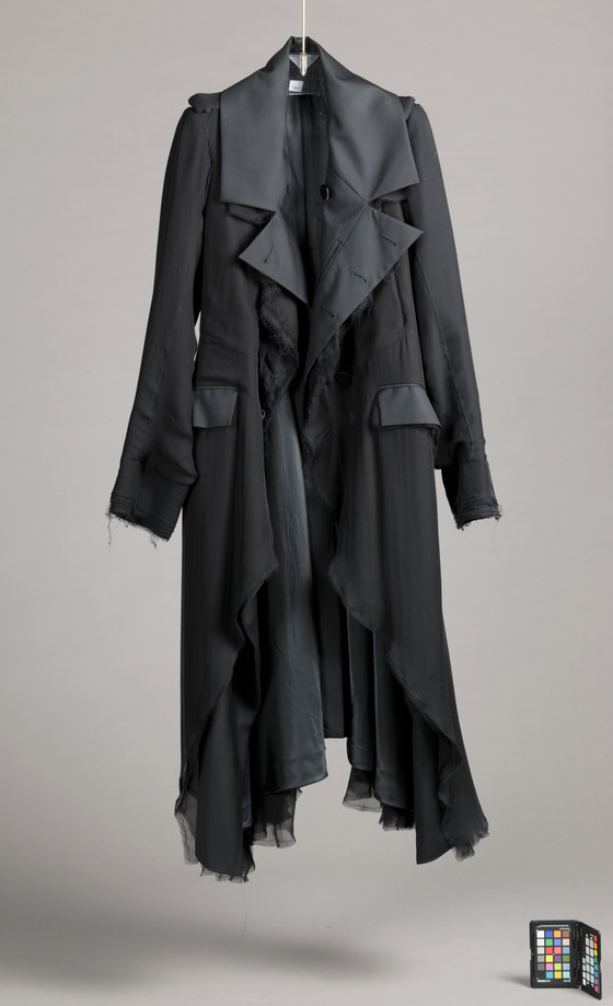 Silk plain weave (chiffon) and silk/wool twill (gabardine) with silk satin (peau de soie) covered buttons