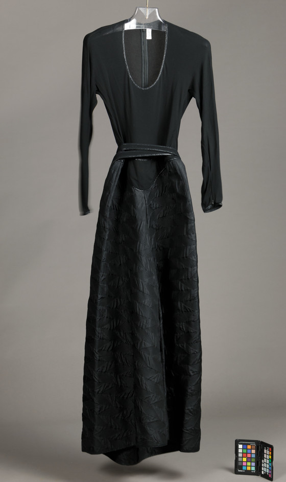 Dress: Silk double weave and silk knit (jersey) with metallic plastic thread trim