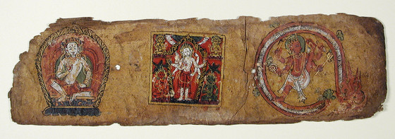 Enthroned white figure in abhaya gesture (left), Enthroned white multi-armed figure (middle), Red figure with upraised leg in circle/serpent (right), Folio from a Pancharaksha (The Five Protective Charms)
