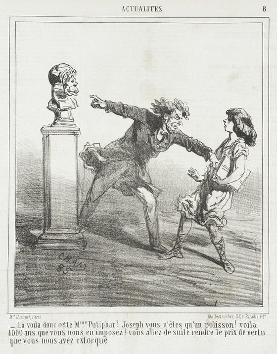 La voila donc cette Mme. Putiphar? Joseph vous n'êtes qu'un polisson! Voilà 4.000 ans que vous nous en imposez! Vous allez de suite rendre le prix de vertu que nous nous avez extorqué.