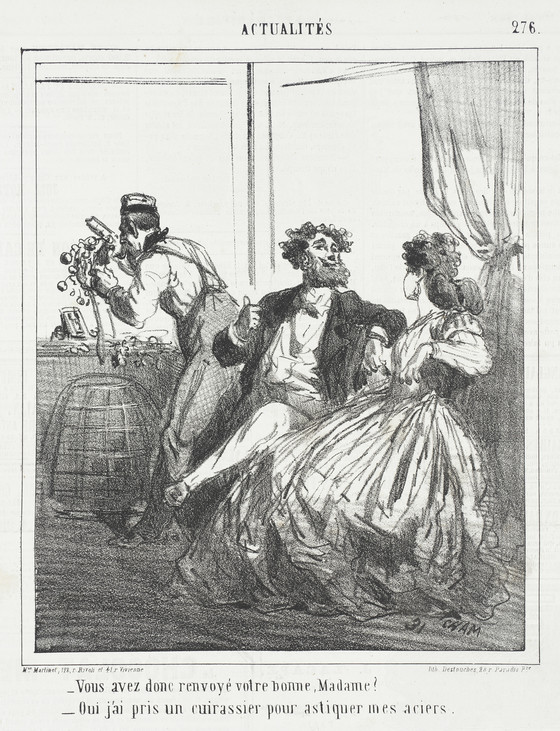 Vous avez donc renvoyé votre bonne, Madame? -Oui j'ai pris un cuirassier pour astiquer mes aciers.