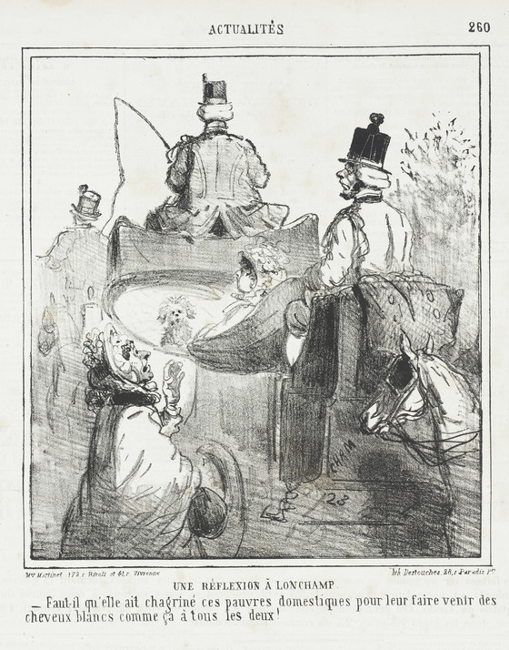 Une Réflection à Lonchamp. Faut-il qu'elle ait chagriné pauvres domestiques pour leur faire venir des cheveux blancs comme ça à tous les deux!