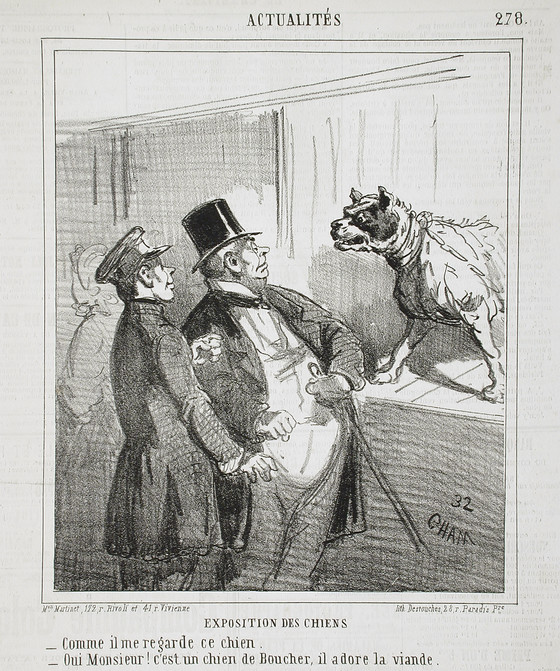 Exposition des chiens: Comme il me regarde ce chien. -Oui Monsieur! c'est un chien de boucher, il adore la viande