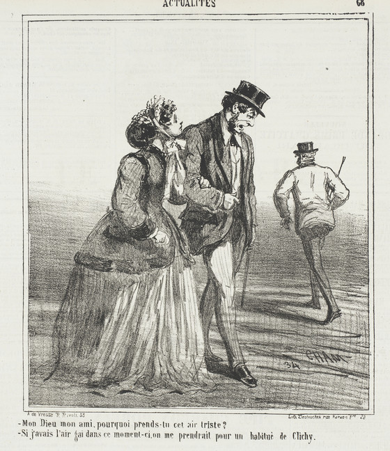 Mon Dieu, mon ami, pourquoi prends tu cet air triste? -Si j'avais l'air gai dans ce moment-ci, on me prendrait pour un habitué de Clichy.