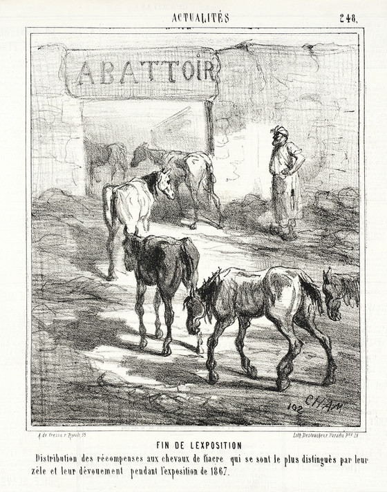 Fin de l'exposition. Distribution des récompenses aux chevaux de fiacre qui se sont le plus distingués par leur zèle et leur dévouement pendant l'exposition de 1867