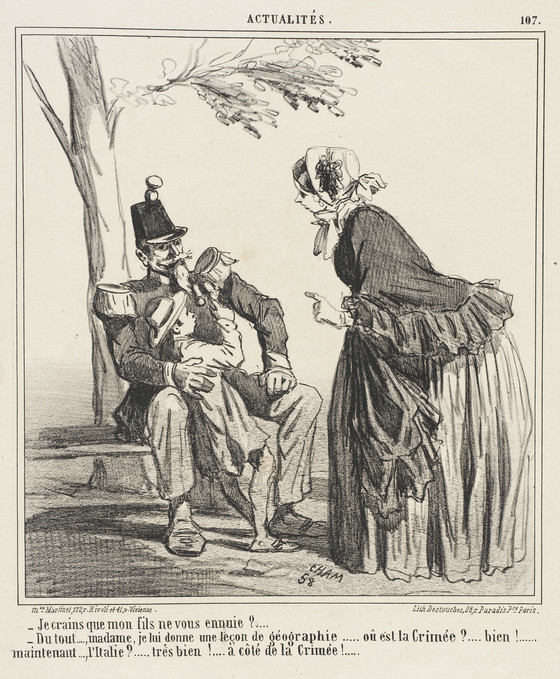 Je crains que mon fils ne vous ennuie?...-Du tout madame, je lui donne une leçon de geographie...Ou est la Crimée?...bien! Maintenant...l'Italie? tres bien!...à côte de la Crimée!...