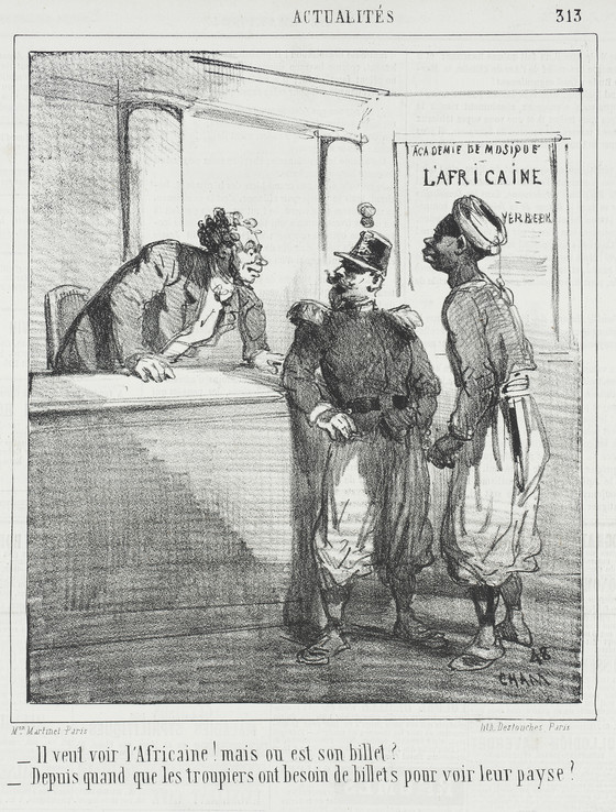Il veut voir l'Africaine! mais ou est son billet? -Depuis quand que les troupiers ont besoin de billets pour voir leur payse? (Academie de music presente l'Africaine)