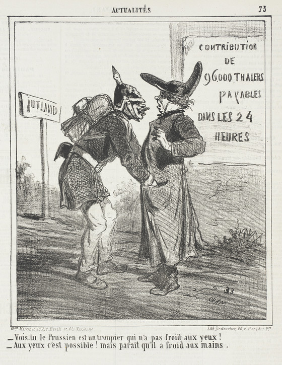 Vois-tu le Prussien est un troupier qui n'a pas froid aux yeux! . . . Aux yeux c'est possible! Mais parait qu'il à froid aux mains. (Contribution de 96.000 Thalers payable dans les 24 heures)