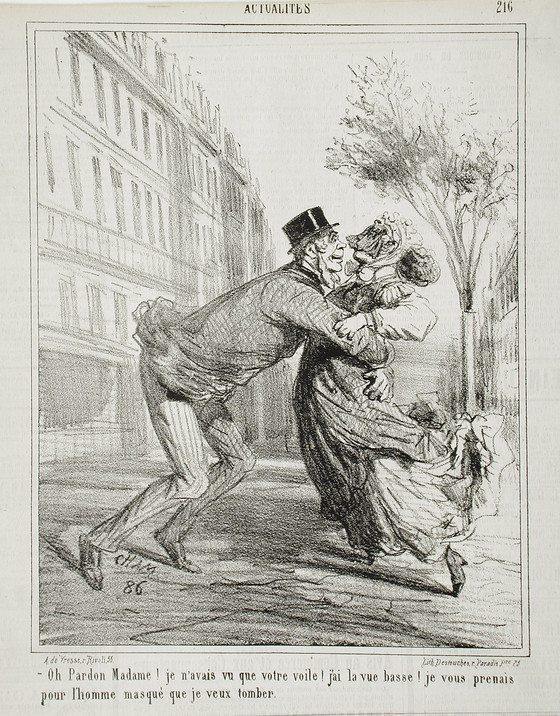 Oh pardon madame! Je n'avais vu que votre voile! J'ai la vue basse! Je vous prenais pour l'homme masqué que je veux tomber.