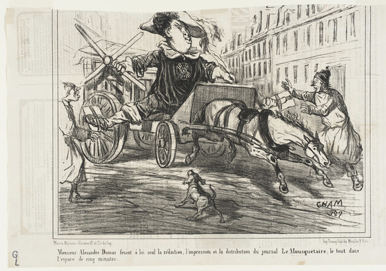 Monsieur Alexandre Dumas fesant à lui suel la rédaction, l'impression et la distribution du journal 'le Mousquetaire', le tout dans l'espace de cinq minutes.