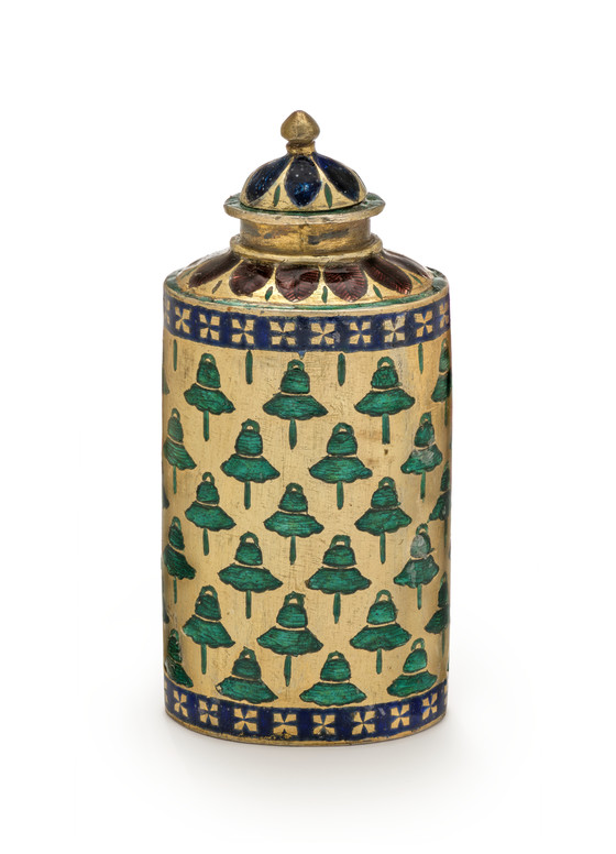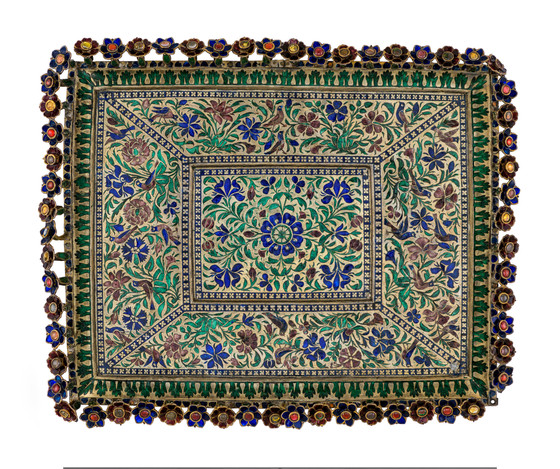 Enameled silver inlaid with foil-backed gemstones and pastes; enameled gilded silver