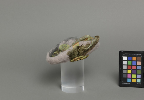 Fur felt with silk net, silk plain weave (taffeta) and feathers
