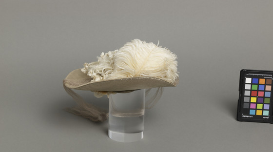 Silk velvet with silk plain weave, linen plain weave (buckrum), ostrich feather, and silk net