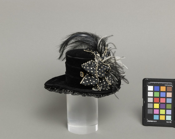 a) Silk velvet with silk lace, silk plain weave with silk supplementary warp patterned ribbon with ostrich feather and vulture feather b) Metal and crystal