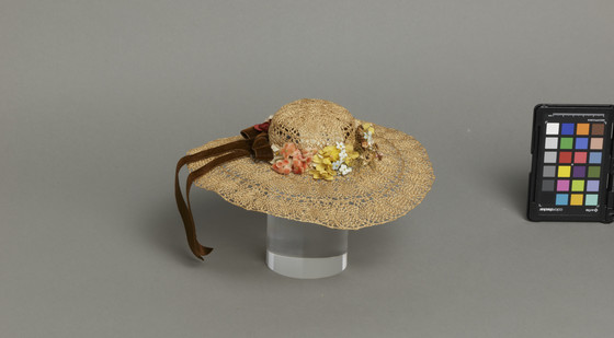 Straw, plaited, with silk velvet and linen plain weave (buckram)