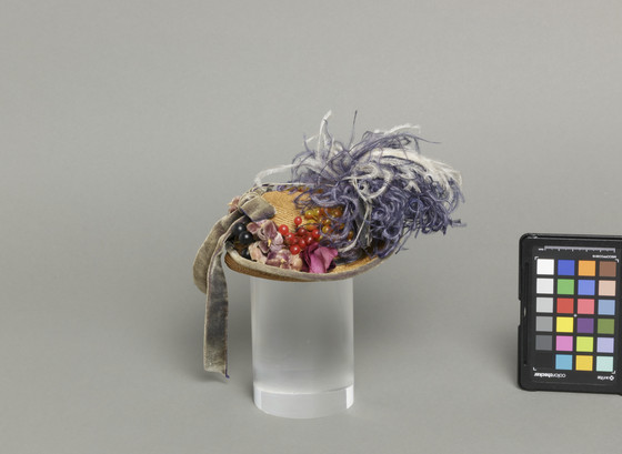 Straw, braided, with silk velvet, ostrich feather, and plastic