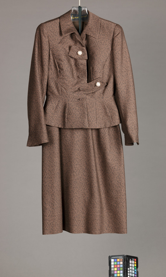 Jacket: Wool plain weave, printed, with metal and crystal buttons. Skirt: Wool plain weave, printed.
