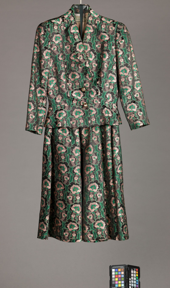 Jacket: Silk satin with silk supplementary weft patterning, metal buttons. Skirt: Silk satin with silk supplementary-weft patterning.