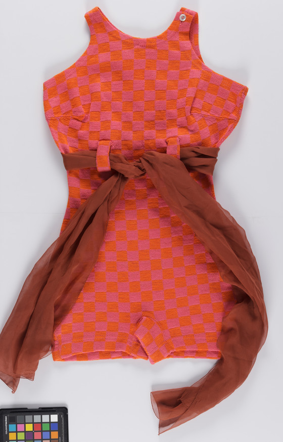 Swimsuit: wool knit; Belt: silk plain weave (crepe chiffon)