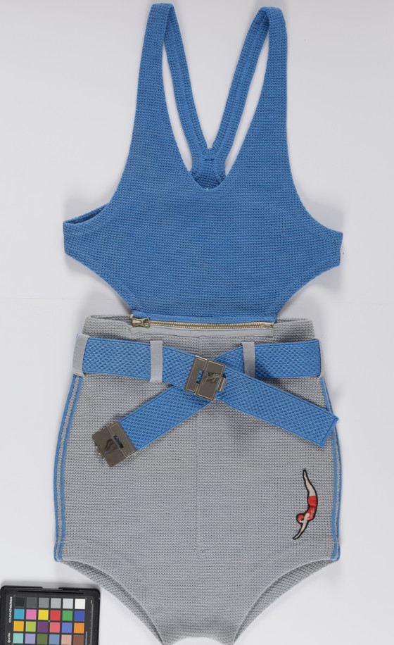 Top: wool knit and metal; Trunks: wool knit with rayon emboidered appliqué and metal; Belt: wool braid (webbing) and metal