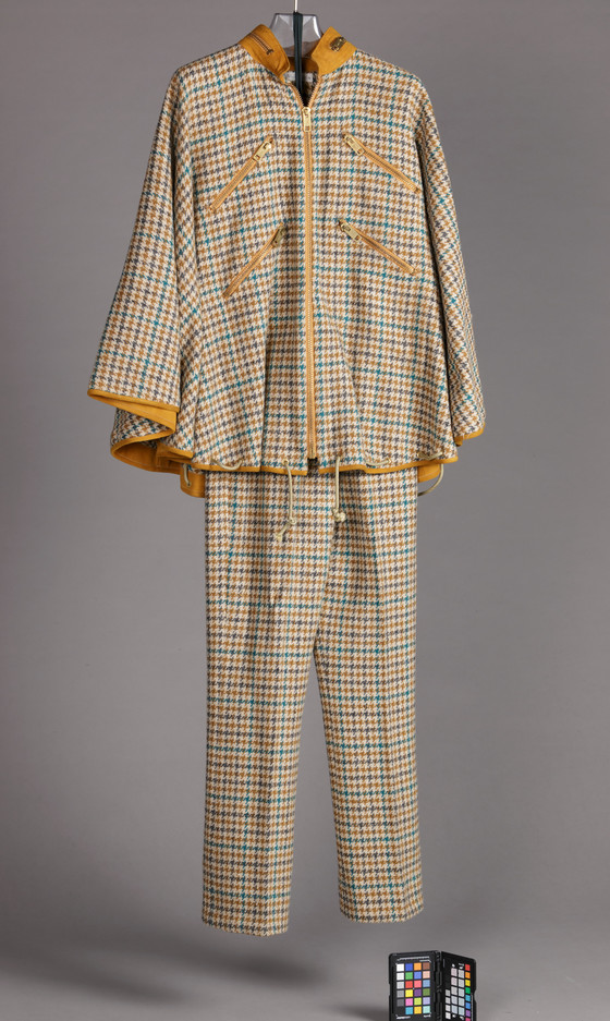 Cape: metal zippers, nylon cord, wool twill, Suede leather Pants: wool twill, Suede leather