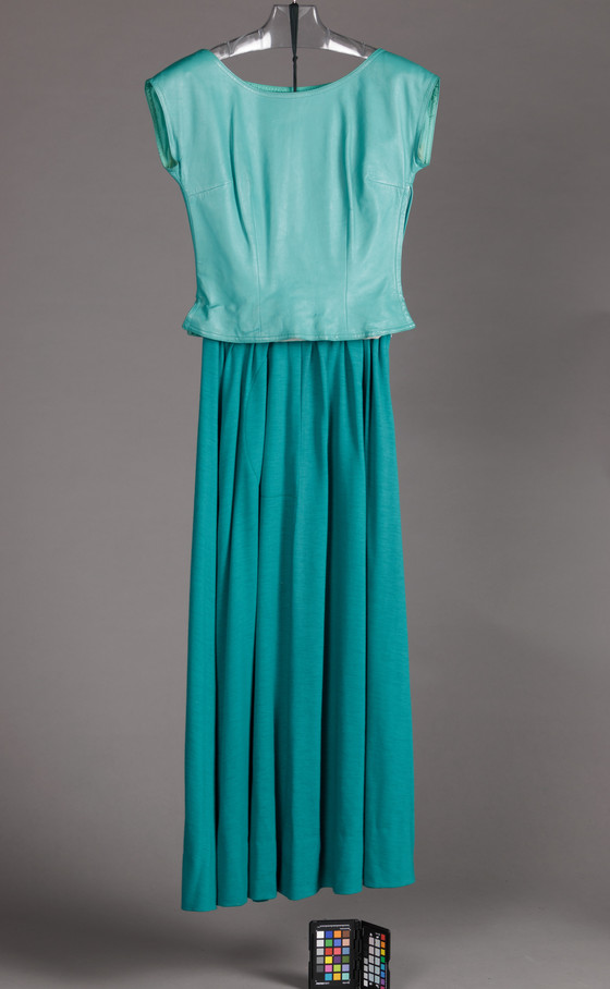 Blouse: vinyl; Skirt: wool knit, vinyl, metal fastener