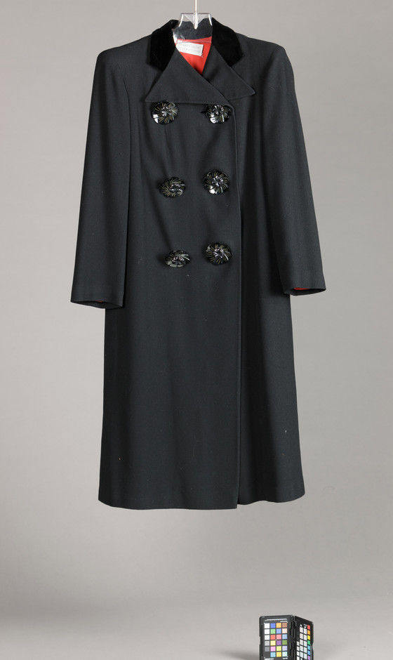 Wool plain weave (crepe); silk velvet; bakelite buttons