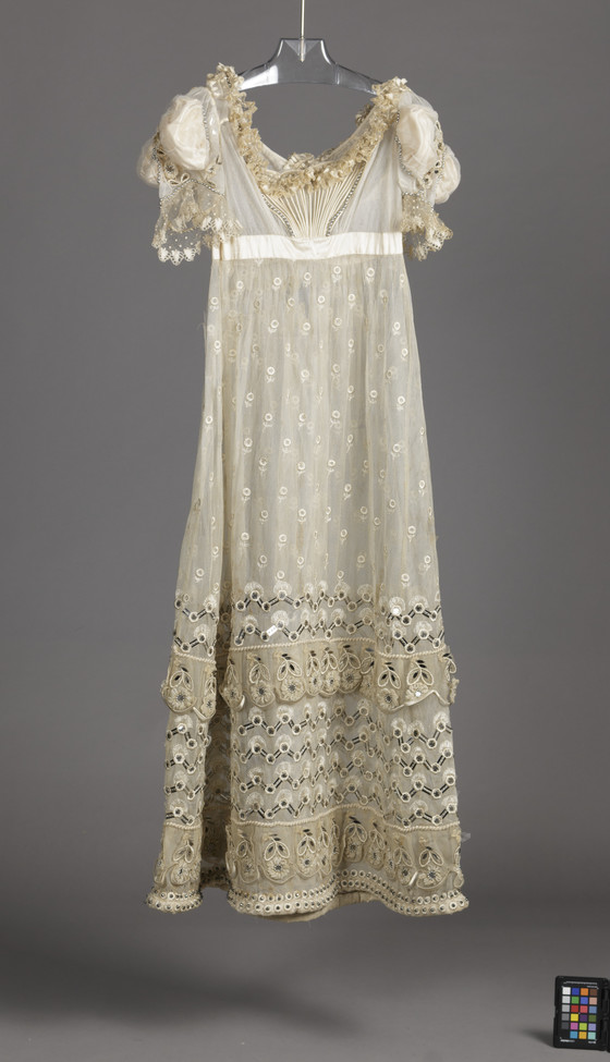 Silk net with silk embroidery, metal sequins, metal beads, silk satin, silk and metal chenille, and silk lace