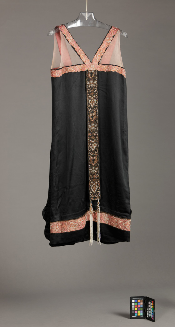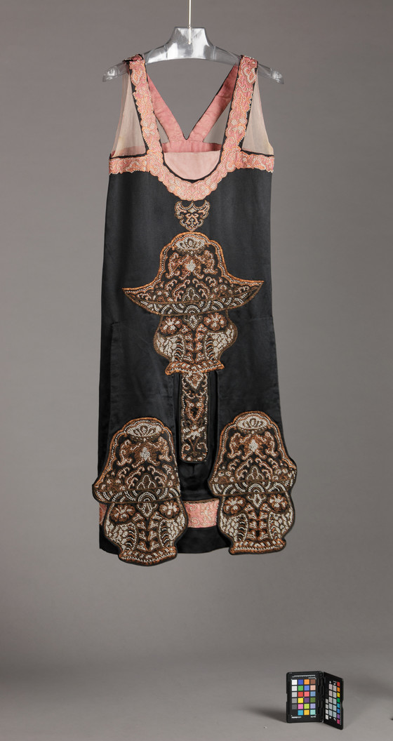 Silk satin (crepe back) and silk plain weave with metallic-thread supplementary-weft patterning, metallic-thread embroidery, faux pearls, and silk tulle