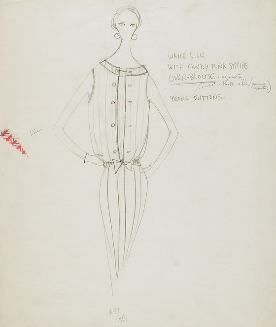 Pencil and ink on vellum with woven silk fabric swatch attached