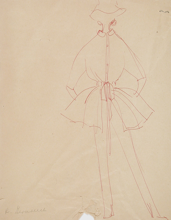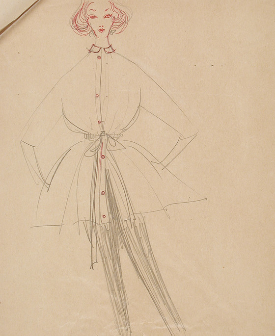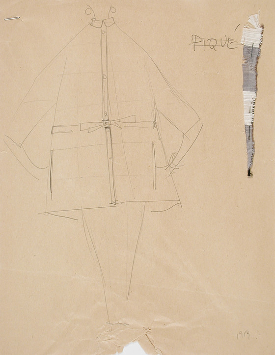 a) Pencil on paper with silk shantung fabric swatch attached; b) Pencil and ink on paper; c) Ink on paper
