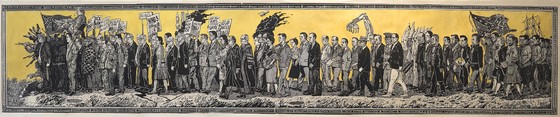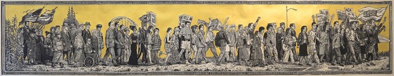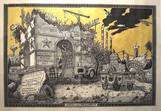Woodcut from 20 carved plywood blocks. Hand-embellished with gold acrylic. Printed on gampi paper using a Dufa flatbed offset press. Sheets are joined and backed twice with sekishu kozo paper