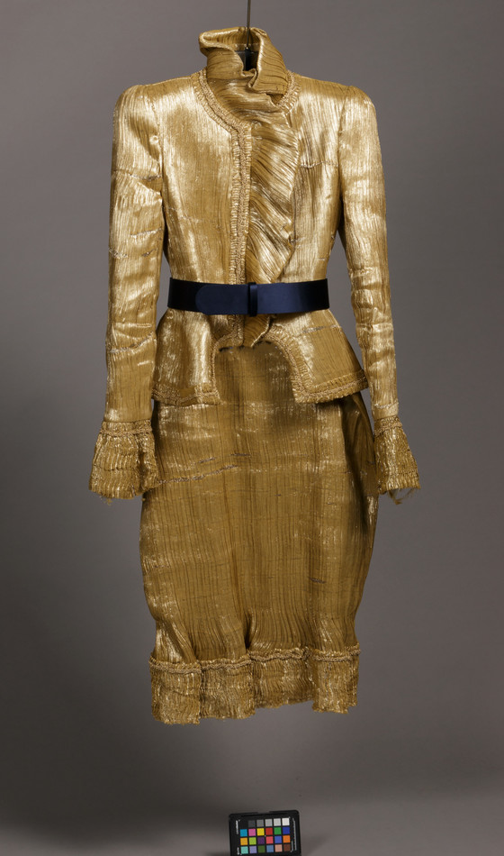 Jacket and Skirt: Metallic-thread/polyester/silk plain weave, heat-set pleated, with metallic beads