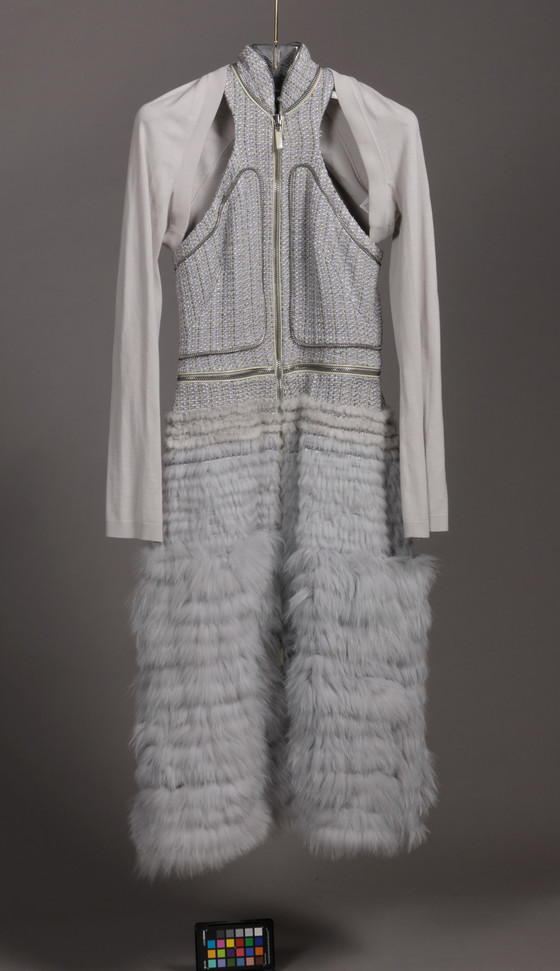 Dress: Silk plain weave with leather and mink, raccoon, rabbit, and fox fur appliqués