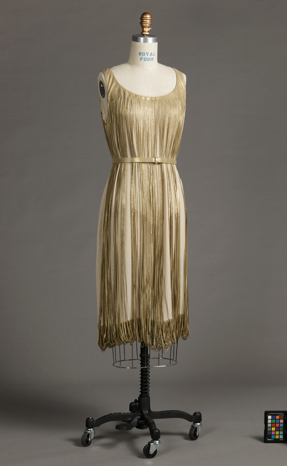 Dress: leather, laser cut, and silk plain weave (crepe); Belt: leather