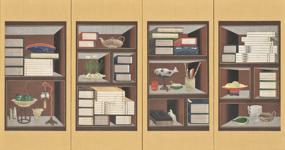 four-panel screen, ink and color on paper