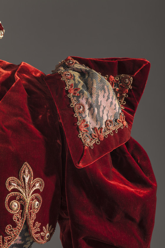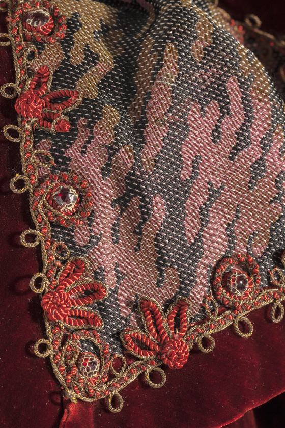 Bodice: silk velvet and silk compound weave with supplementary warp floats, linen lace, cotton, silk, and metallic-thread applique and glass beads; Skirt: silk velvet and silk compound weave with supplementary warp floats