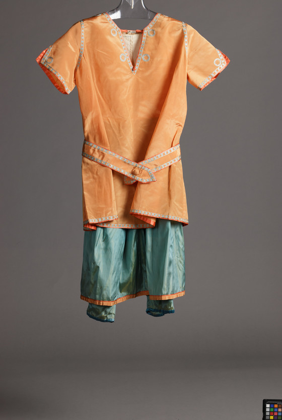 Top: silk plain weave with silk embroidery, silk satin cord, and glass beads; Pajama: silk plain weave, cotton plain weave, with silk satin; Hat: silk plain weave with silk satin; Sash: silk plain weave with silk embroidery and silk satin