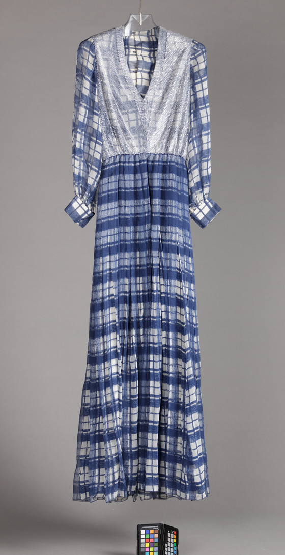 Dress: silk plain weave (crepe), printed, glass beads; Belt: silk plain weave (crepe), printed, patent leather, lucite