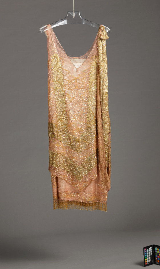 Silk lace and silk satin with metallic-thread and silk satin (lamé), plastic sequins, glass beads, and crystals