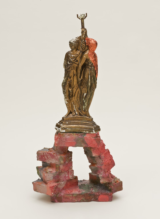 Cast plaster with bronze paint and red aluminum foil; hard foam with Day-Glo paint