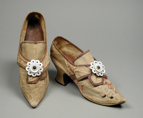 a,b) Shoes: Brocaded silk, leather, linen, kid leather; c,d) Buckles: conch shell, brass, metal