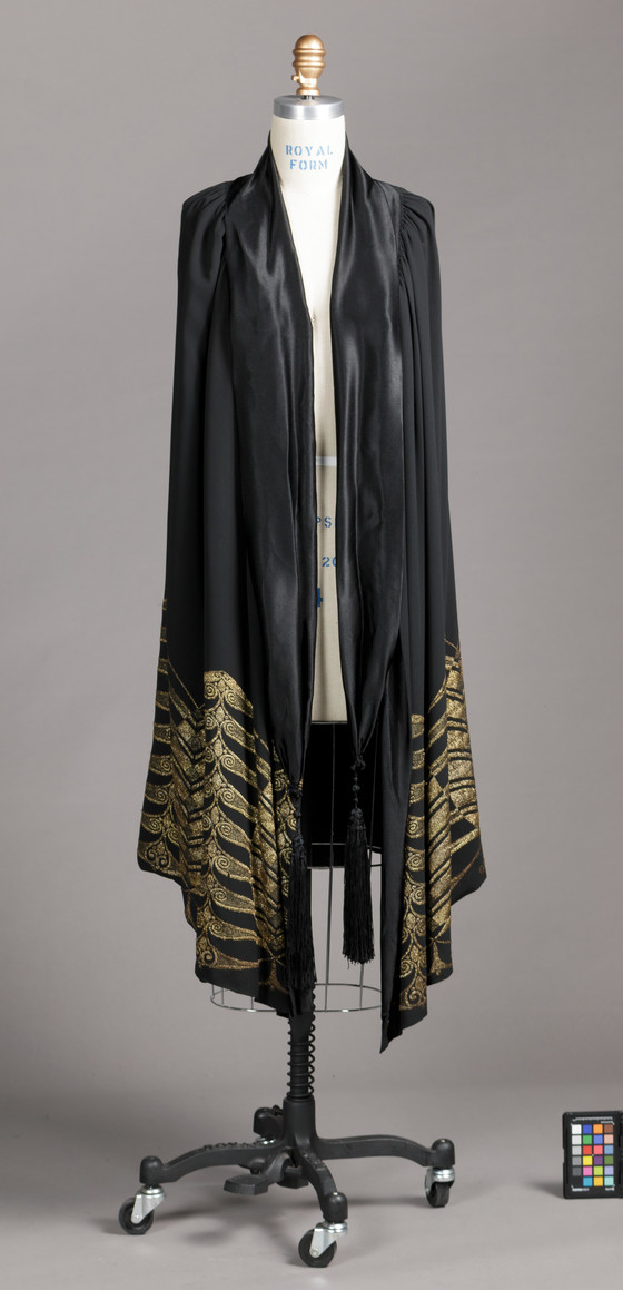 Silk plain weave (crepe) with metallic thread supplementary-warp patterning and silk tassels