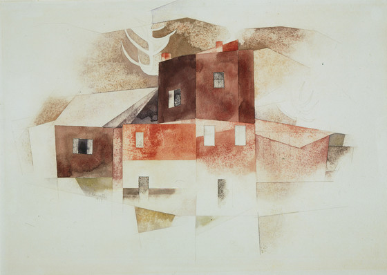 In the Bermuda watercolors Demuth for the first time controlled his previously rhythmic line, limited his forms to geometric shapes, and faceted objects into overlapping planes and directional lines. The landscape becomes a carefully composed arrangement of prismatic light and darker geometric areas. His new classicism of line and image usually is accompanied by a soft, hushed palette. Old Houses is more vivid than other Bermuda watercolors, its color restricted to earth tones with a strong orange rectangle in the center. Demuth took advantage of the white of the paper by allowing the colored planes to fade into the background and blotted the watercolor to achieve a mottled effect.