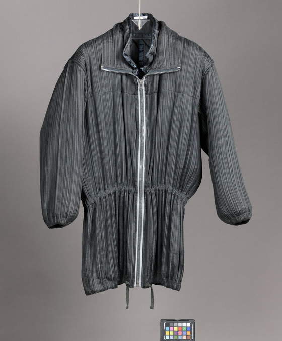 Coat: Polyester plain weave, heat- and pressure- set pleated, with plastic zipper