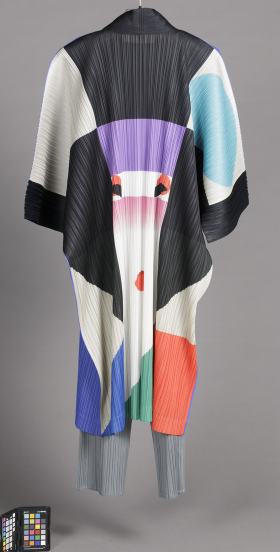 'Nihon Buyo' Coat: polyester knit, printed, heat- and pressure-set pleats; Top: polyester knit , heat- and pressure-set pleats; Pants: polyester knit, heat- and pressure-set pleats