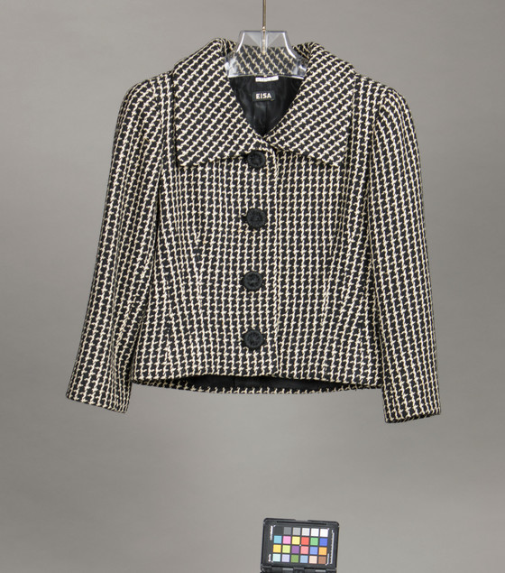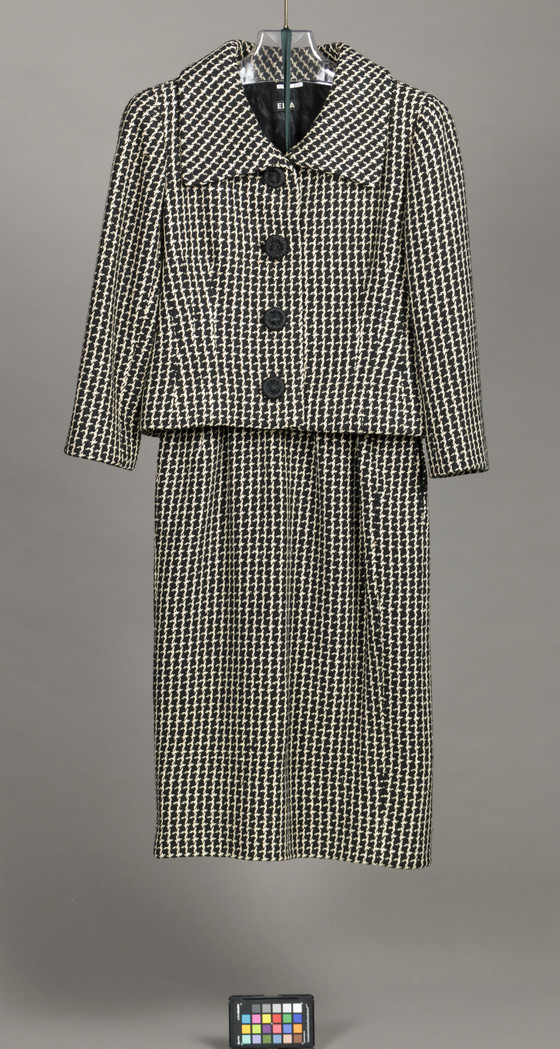 Jacket: wool twill with silk cord buttons. Skirt: wool twill.