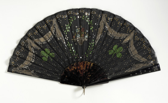 Silk organdy leaf, tortoise shell sticks, silver metallic over brass loop, brass metallic rivet