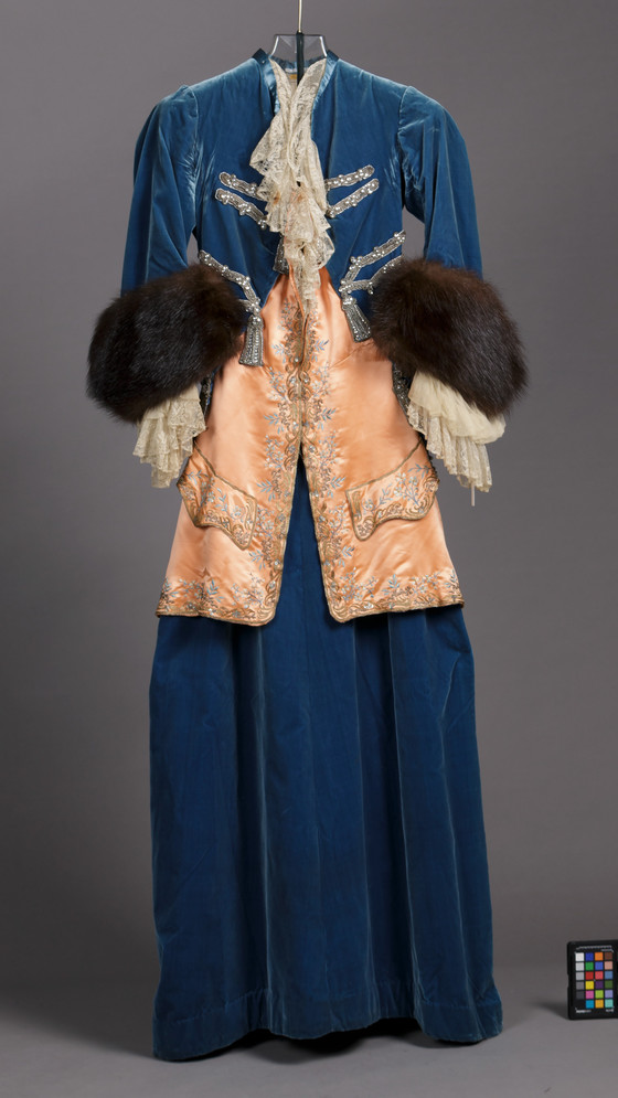 Bodice) Silk velvet with metallic thread and crystal appliqués with silk lace and fur trim, silk satin with silk and metallic thread embroidery, metal beads, and glass sequins with silk lace